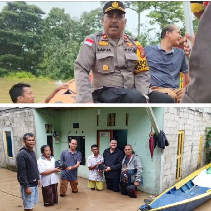 KOMPOL Sabja Di lokasi banjir kepada media menyampaikan ” saya bersama Bapak Camat Kelokasi banjir untuk memberi bantuan kepada warga masyarakat yang terdampak banjir dan kami menghimbau kepada masyarakat untuk selalu berhati-hati karena curah hujan masih tinggi karena air masih naik.