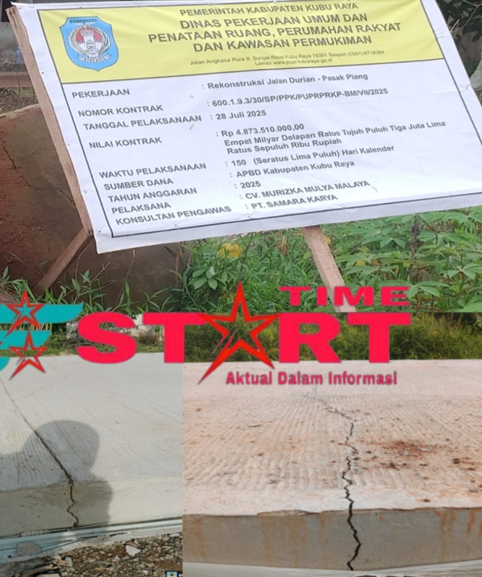 Startime news.com. minggu 16 november 2025. Kubu Raya — Proyek pembangunan jalan di Desa Durian, Kecamatan Sungai Ambawang, Kabupaten Kubu Raya, menuai sorotan tajam dari masyarakat. Pekerjaan yang menggunakan anggaran mencapai Rp4.873.510.000 (± Rp4,8 miliar) itu diduga tidak sesuai standar dan terkesan dikerjakan asal-asalan, setelah ditemukan banyak keretakan di sejumlah titik.