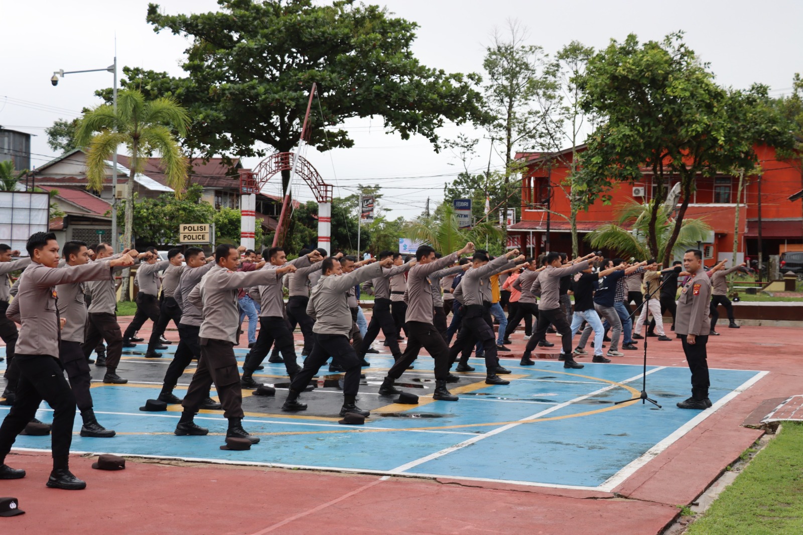 Usai rangkaian apel pagi, Kompol Aang memimpin langsung latihan bela diri yang berlangsung dengan cukup intens. Para personel tampak antusias mengikuti setiap instruksi, mulai dari teknik dasar pertahanan diri hingga gerakan taktis yang biasa digunakan dalam penanganan situasi darurat di lapangan.