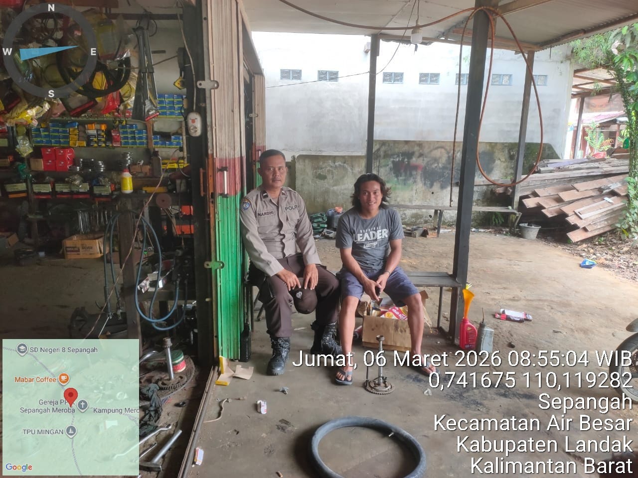 Landak,kalbar ~ startimenews.com ~ Polsek Air Besar ~ Polres Landak ~ Polda Kalbar ~ Suasana siang yang cukup terik tidak menyurutkan semangat aparat kepolisian untuk terus menjaga keamanan wilayah. Pada Jumat (6/3/2026), personel kepolisian melaksanakan patroli siang dan menyambangi sebuah bengkel yang sedang beroperasi. Kegiatan ini sekaligus dimanfaatkan untuk berdialog langsung dengan para karyawan bengkel serta memberikan imbauan terkait keamanan dan ketertiban masyarakat.