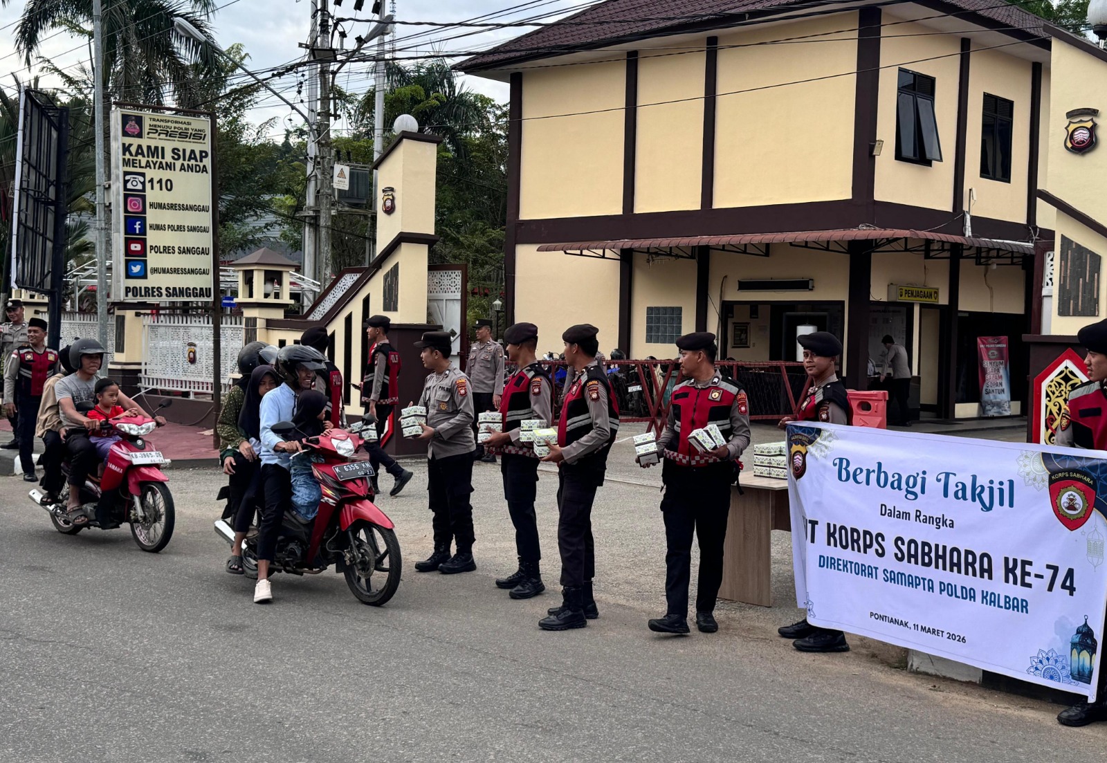 Selain kegiatan pembersihan, personel Sat Samapta Polres Sanggau juga melaksanakan pembagian takjil kepada masyarakat dan pengguna jalan di Jalan Jenderal Sudirman, Kelurahan Ilir Kota, Kecamatan Kapuas, Kabupaten Sanggau. Aksi berbagi tersebut disambut antusias oleh masyarakat yang melintas menjelang waktu berbuka puasa.